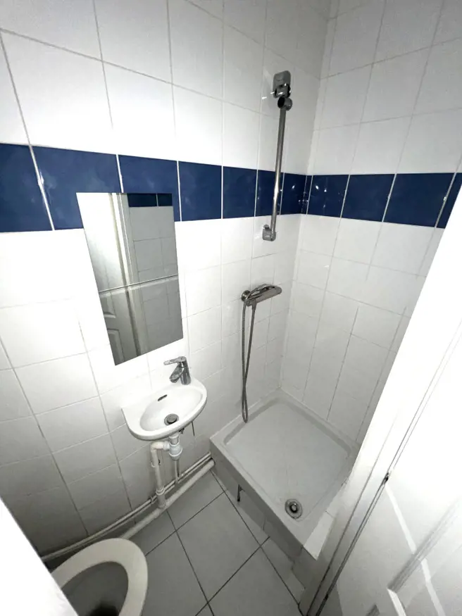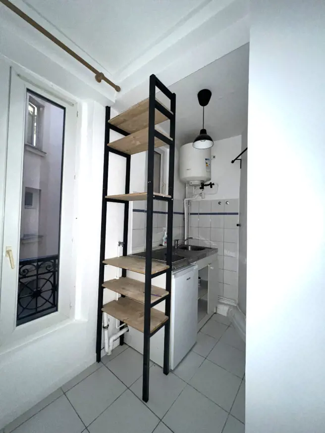 Avenue Simon Bolivar, face au métro, quartier commerçant, dans un immeuble avec digicodes au 1er étage, studio en bon état comprenant pièce principale avec kitchenette aménagée (évier- plaques de cuisson, réfrigérateur), salle d'eau avec WC.